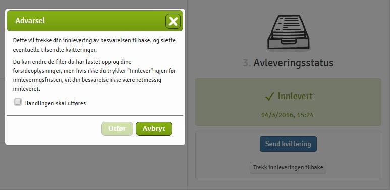 Dersom det ikke er satt begrensninger for dette, kan du trekke besvarelsen din uendelig mange ganger inntil innleveringsfristen har gått ut. Husk bare å slette den gamle fila før du leverer inn, slik at du ikke leverer to versjoner.