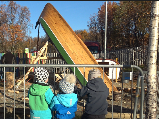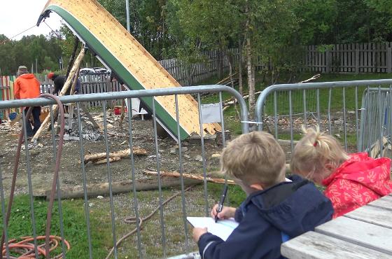 Bak et sikkerhetsgjerde i barnehagen har barna observert og dokumentert ferdigstillingen av lekeinstallasjonene.