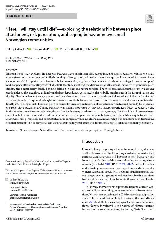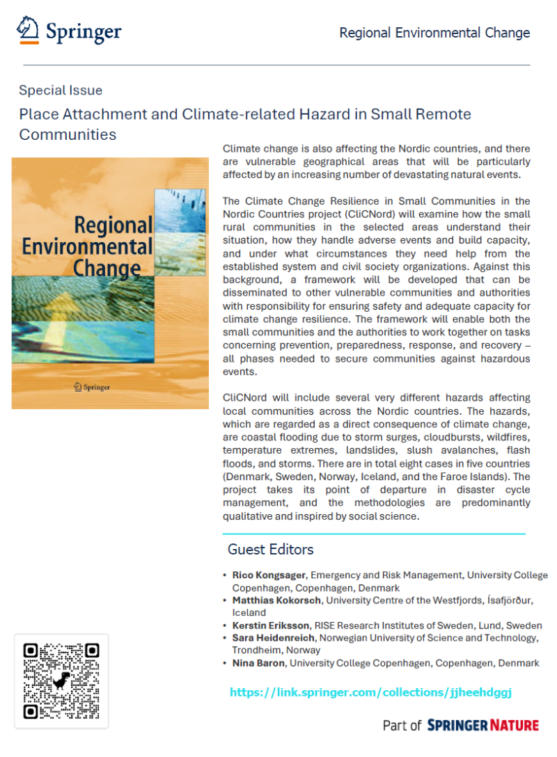 The Special Issue Place Attachment and Climate-related Hazard in Small Remote Communities by The Climate Change Resilience in Small Communities in the Nordic Countries project (CliCNord) is finally out!