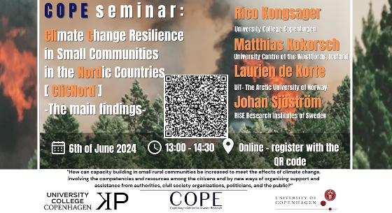 COPE Seminar (06.06.2024): Climate Change Resilience in Small Communities in the Nordic Countries (CliCNord) - the main findings, with participation from our researcher Laurien de Korte.