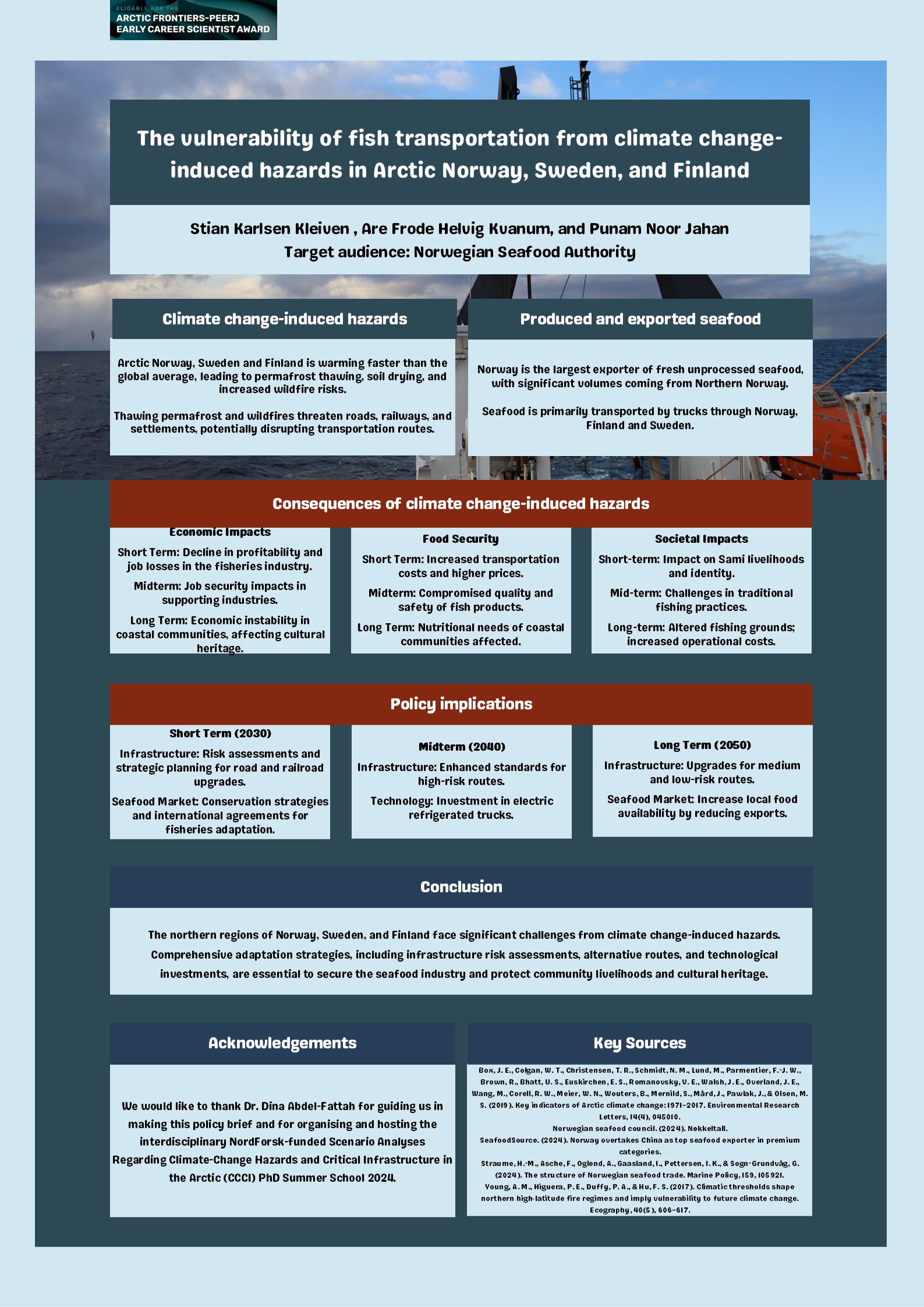 On 27 January 2025, PhD candidate Stian K. Kleiven participated in Arctic Frontiers: Beyond boarders with a poster presentation of a policy brief titled “The vulnerability of fish transportation from climate change-induced hazards in Arctic Norway, Sweden, and Finland”.