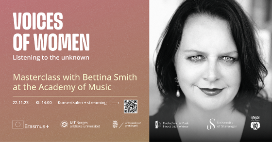 I forbindelse med prosjektet/konferansen Voices of Women arrangeres mesterklasse med Bettina Smith, professor i sang ved Universitetet i Stavanger.