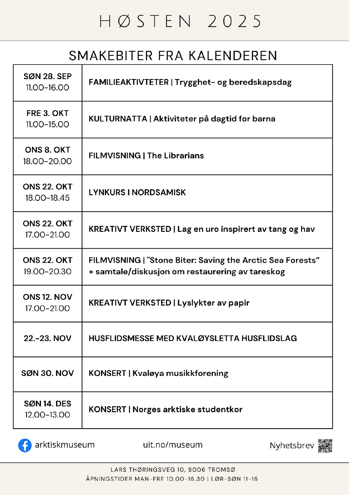 Barneaktiviteter, omvisninger, film, kreative verksted, diskusjoner og mer til - høsten ved museet byr på noe for enhver smak. Arrangementsprogrammet utvikles og oppdateres fortløpende. Følg med i våre kanaler for siste nytt.
