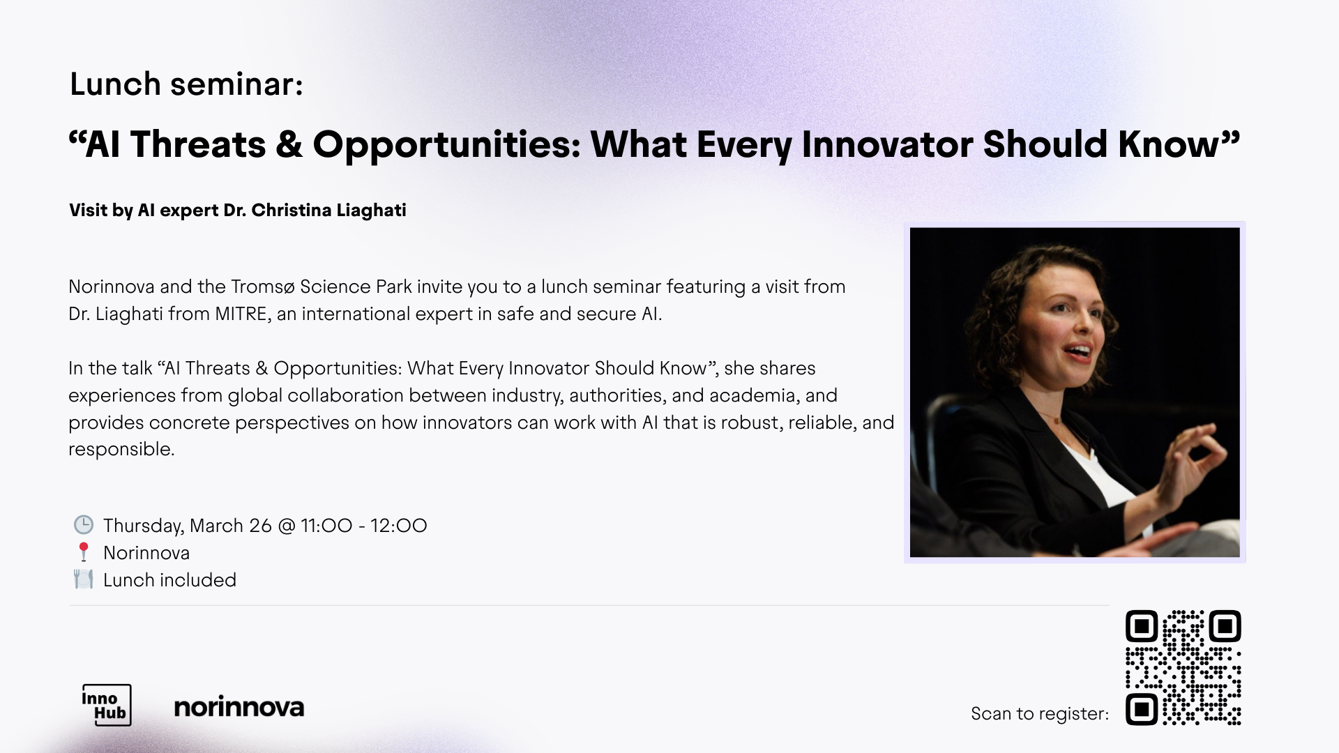 Norinnova and the Tromsø Science Park, in cooperation with UiT's InnoHub, invite you to a lunch seminar featuring a visit from Dr. Liaghati from MITRE, an international expert in safe and secure Al.